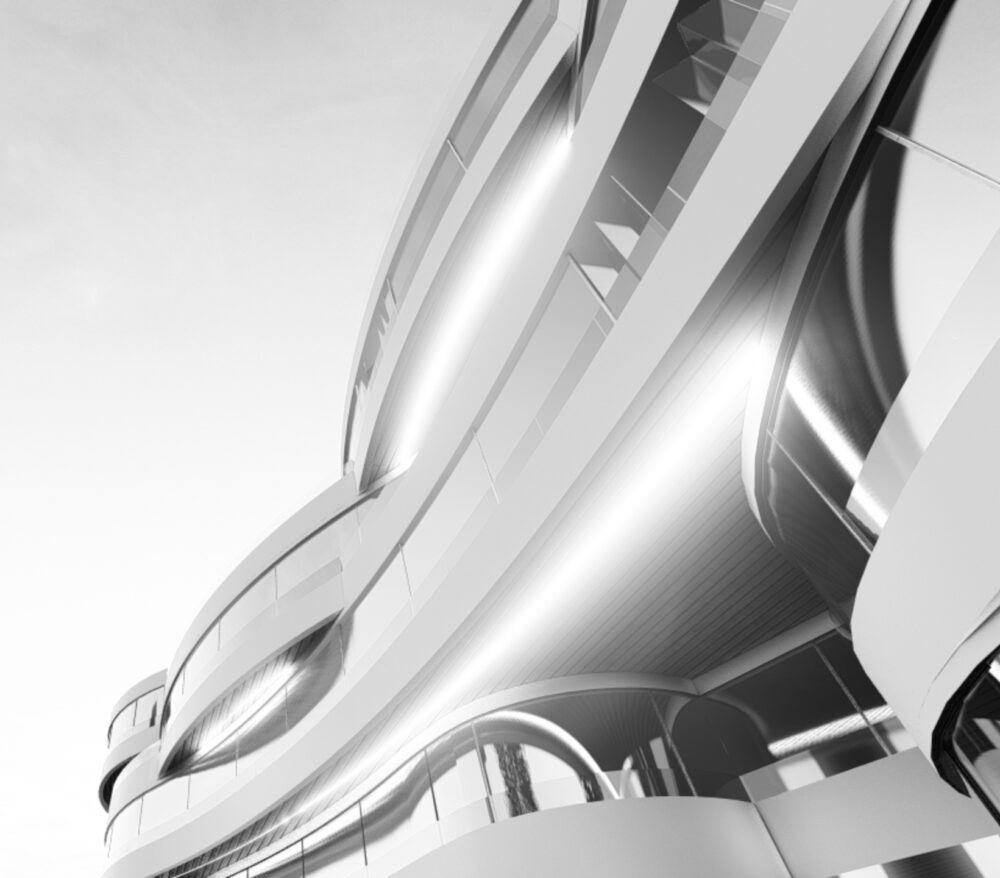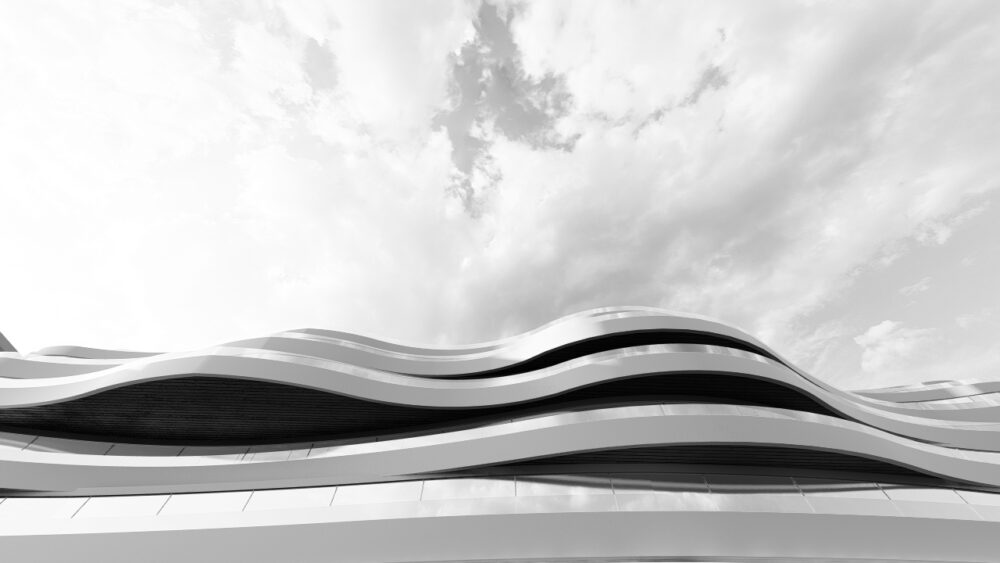 Ląd i obiekty lądowe są stałe i bardziej jednoznaczne w formie, dlatego bryła ma prostą formę, podkreśloną jednolitą strukturą ściany osłonowej. Biała perforowana osłona budynku uspokaja bryłę i wpisuje się w kolorystykę miasta. Perforacja wykonana jest z prostokątów o proporcjach okien modernistycznych budynków Gdyni. Zagęszczenia perforacji tworzą rysunek układający się w izohipsy – poziomice na mapach przedstawiających topografię lądu. Na elewacji naszego projektu przedstawiliśmy topografię gdyńskich klifów. Patrząc na elewację budynku od strony Skweru Kościuszki widzimy, jak część wschodnia budynku – „morze” częściowo przekazuje swoją estetykę budynkowi zachodniemu – „lądowi”. To nasza architektoniczna alegoria. Morze „wlewa” się na ląd i obmywa go swoimi falami. Jest to też przesłanie do nas i przestroga zarazem. Jeśli nie zadbamy o klimat i o naszą planetę, morze zabierze nam najcenniejsze miejsca do życia. Być może również takie, jak ta konkretna lokalizacja. Styk symbolicznego „morza i lądu” zamierzamy podkreślić zmieniającą się estetyką nawierzchni. Południowo-zachodni narożnik budynku, obniża się do poziomu wyjść ewakuacyjnych z klubu „Nowy Pokład”. Obniżenie sprowadza nas poniżej obecnego poziomu morza. Ten poziom też chcemy pokazać na warstwie wykończeniowej elewacji. Jeśli nasz budynek powstanie, chcielibyśmy co 10 lat potwierdzać na elewacji aktualny poziom morza. Gdyby okazało się, że ten poziom się podnosi i „Nowy Pokład tonie”, byłoby to swoistym memento dla odwiedzających budynek.