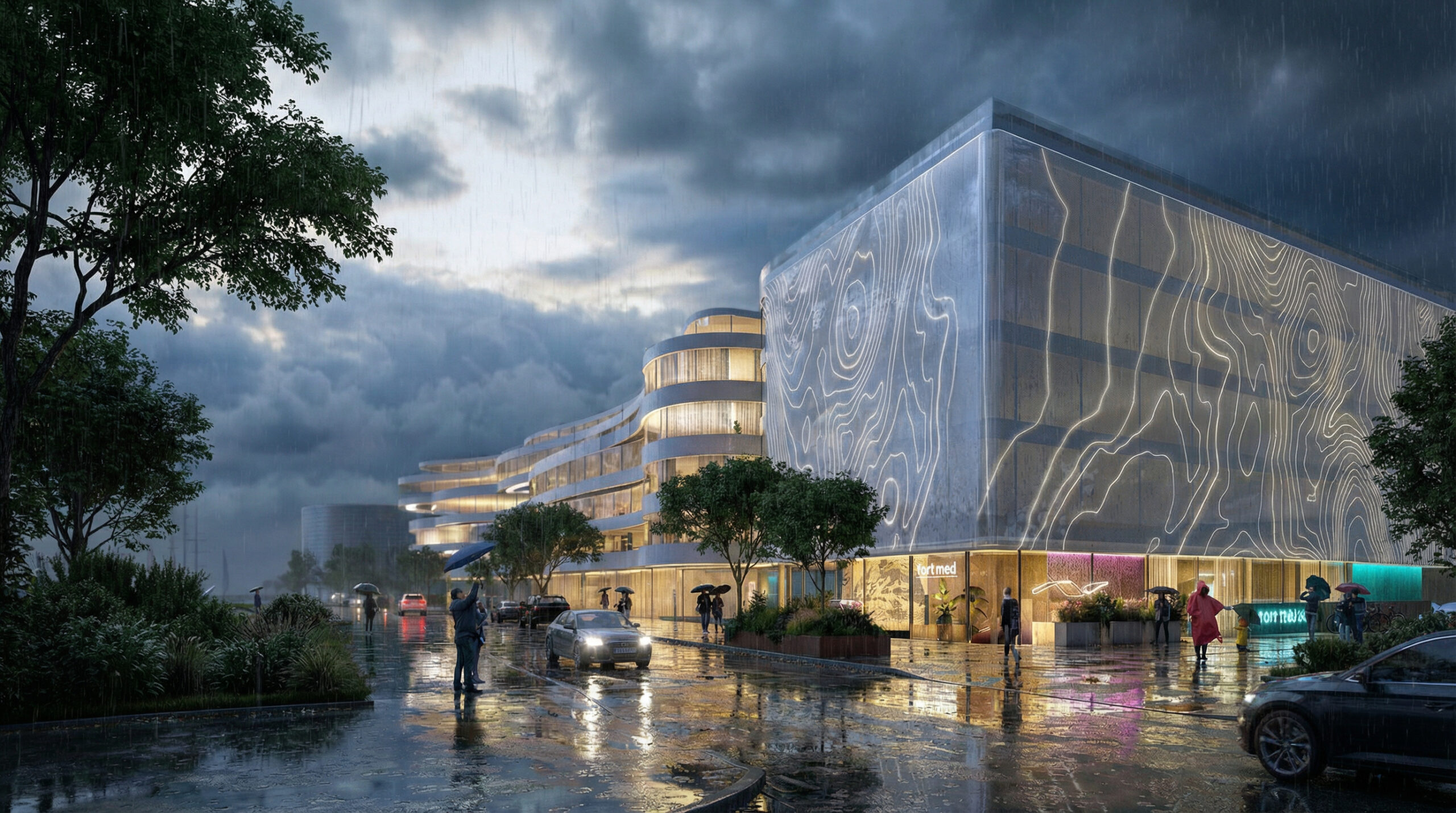 Ląd i obiekty lądowe są stałe i bardziej jednoznaczne w formie, dlatego bryła ma prostą formę, podkreśloną jednolitą strukturą ściany osłonowej. Biała perforowana osłona budynku uspokaja bryłę i wpisuje się w kolorystykę miasta. Perforacja wykonana jest z prostokątów o proporcjach okien modernistycznych budynków Gdyni. Zagęszczenia perforacji tworzą rysunek układający się w izohipsy – poziomice na mapach przedstawiających topografię lądu. Na elewacji naszego projektu przedstawiliśmy topografię gdyńskich klifów. Patrząc na elewację budynku od strony Skweru Kościuszki widzimy, jak część wschodnia budynku – „morze” częściowo przekazuje swoją estetykę budynkowi zachodniemu – „lądowi”. To nasza architektoniczna alegoria. Morze „wlewa” się na ląd i obmywa go swoimi falami. Jest to też przesłanie do nas i przestroga zarazem. Jeśli nie zadbamy o klimat i o naszą planetę, morze zabierze nam najcenniejsze miejsca do życia. Być może również takie, jak ta konkretna lokalizacja. Styk symbolicznego „morza i lądu” zamierzamy podkreślić zmieniającą się estetyką nawierzchni. Południowo-zachodni narożnik budynku, obniża się do poziomu wyjść ewakuacyjnych z klubu „Nowy Pokład”. Obniżenie sprowadza nas poniżej obecnego poziomu morza. Ten poziom też chcemy pokazać na warstwie wykończeniowej elewacji. Jeśli nasz budynek powstanie, chcielibyśmy co 10 lat potwierdzać na elewacji aktualny poziom morza. Gdyby okazało się, że ten poziom się podnosi i „Nowy Pokład tonie”, byłoby to swoistym memento dla odwiedzających budynek.