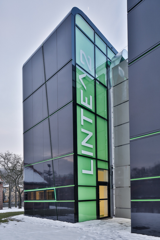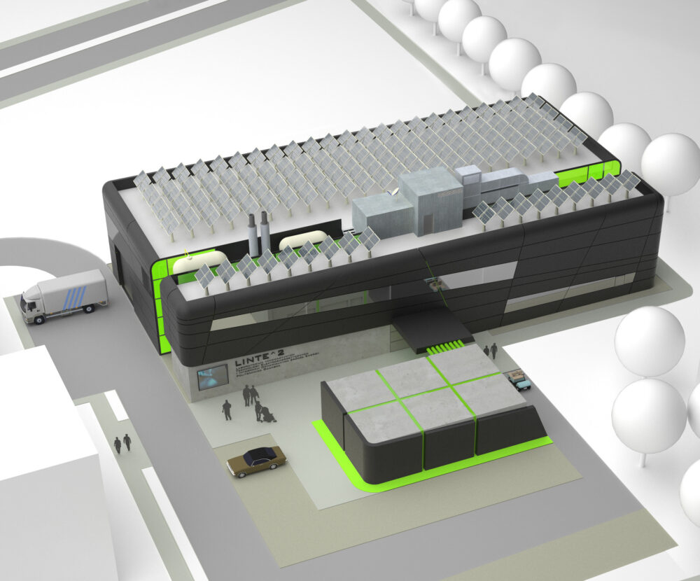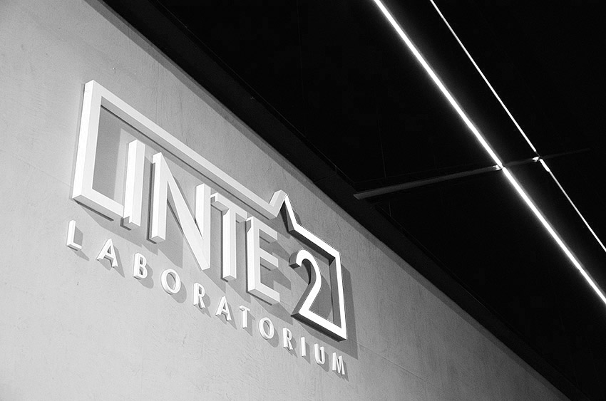 Odniesienie literackie można by znaleźć w tajemniczym „monolicie”, przedstawionym w „Odysei kosmicznej 2001” Stanleya Kubricka i Arthura C. Clarke’a. Wyobrażamy sobie, że tak właśnie mogłyby wyglądać zaawansowane technologicznie obiekty czasów kolonizacji kosmosu. Nasz monolit to tajemnicze urządzenie, które – aby mogło odsłonić nieco swojej tajemnicy – zostało przecięte i rozsunięte, ukazując tętniące zieloną energią innowacyjne i zaawansowane technologicznie wnętrze. Interakcja zachodząca pomiędzy rozsuniętymi modułami naszego monolitu możliwa jest dzięki energii czerpanej z modułu zewnętrznego. Miejsce przecięcia „monolitu” nie jest przypadkowe. Jest kontynuacją ideowych założeń w realnym świecie potrzeb funkcjonalnych budynku, łącząc część halową i biurową laboratorium. Jest to również miejsce umieszczania instalacji oraz urządzeń technicznych. Formalnie zostało podkreślone przeszkleniami oraz jaskrawym kolorem zielonym. Wydzielenie modułu zewnętrznego jest usadzone w naszej idei źródła innowacyjnej energii. Jednocześnie pozwala wyprowadzić z budynku pomieszczenia transformatorów, agregatów oraz wszelkich funkcji technicznych, które wymagają oddalenia od części laboratoryjnej oraz bezpośredniego dostępu z zewnątrz. Wrażenie tajemniczości budynku, a zarazem możliwości absorpcji energii słonecznej, ma potęgować czarny, metaliczny kolor elewacji. Odbywające się wewnątrz procesy elektroenergetyczne są pokazane poprzez oplatającą obiekt sieć zielonych strumieni świetlnych. Uzyskane dzięki nim podziały – konsekwentnie podkreślone układem zlicowanej ze ścianą stolarki okiennej – nadają obiektowi dynamiczny charakter. Nasz projekt wygrał konkurs, a profesjonalny sposób realizacji zyskał uznanie władz uczelni: „We współpracy z inwestorem K&L art design wykazała się profesjonalizmem, zapewniającym opracowanie dokumentacji projektowej na wysokim poziomie oraz uzyskaniem wymaganych uzgodnień i pozwoleń, a także zaangażowaniem w pracę i dużą elastycznością”. [07.03.2011, prof. dr hab. inż. Kazimierz Jakubiuk, Dziekan Wydziału EiA Politechniki Gdańskiej] Zachęcamy do przeczytania artykułu poświęconego Linte^2, który ukazał się w gazecie Architektura & Biznes w 2015r.: str1, str2, str3.