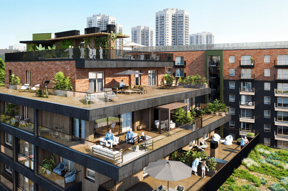 Przestrzeń wewnętrzna z dużą ilością zieleni, indywidualnymi ogródkami dla mieszkańców, miejscem do zabawy dla dzieci i przestrzenią rekreacyjną. Bezpośredni wjazd z ulicy do hali garażowej ograniczy ruch kołowy wewnątrz patio.