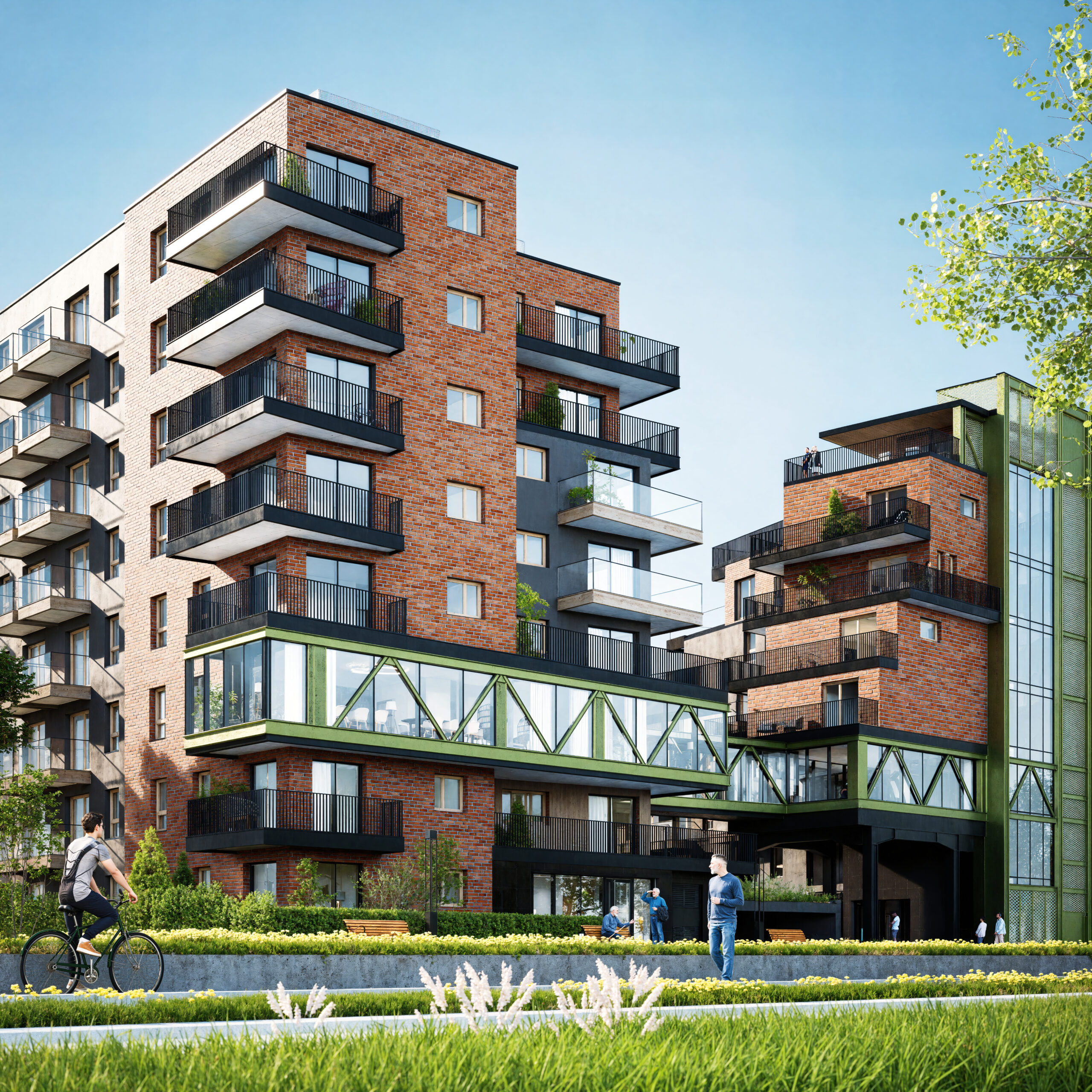 Przy wejściu do osiedla założono duży zadaszony parking dla rowerzystów. Planujemy w części projektu użyć materiałów szlachetnych nawiązujących do architektury Śląska.