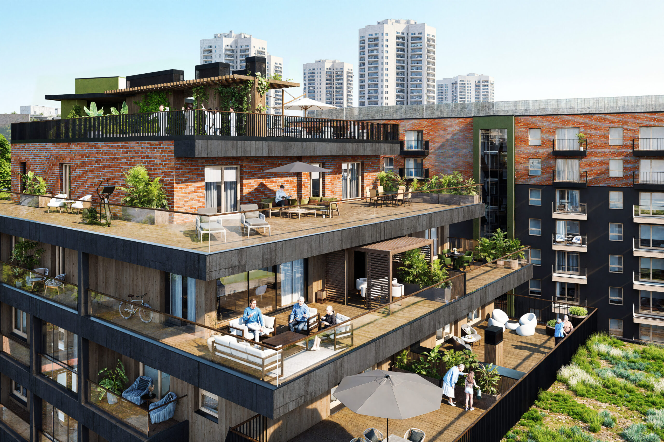 Przestrzeń wewnętrzna z dużą ilością zieleni, indywidualnymi ogródkami dla mieszkańców, miejscem do zabawy dla dzieci i przestrzenią rekreacyjną. Bezpośredni wjazd z ulicy do hali garażowej ograniczy ruch kołowy wewnątrz patio.