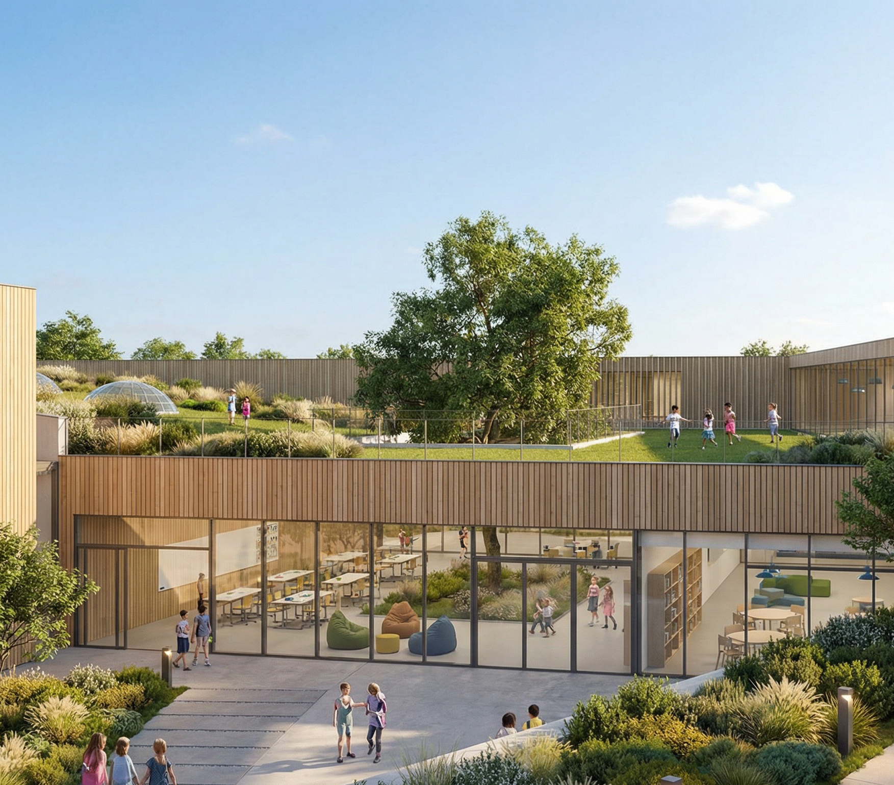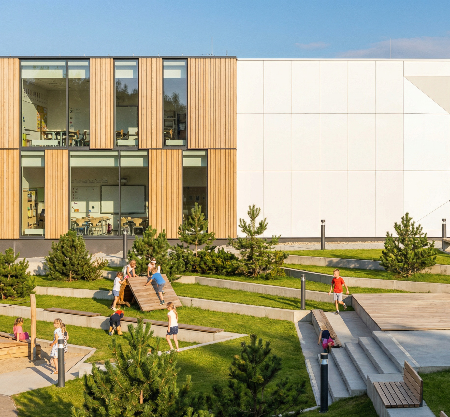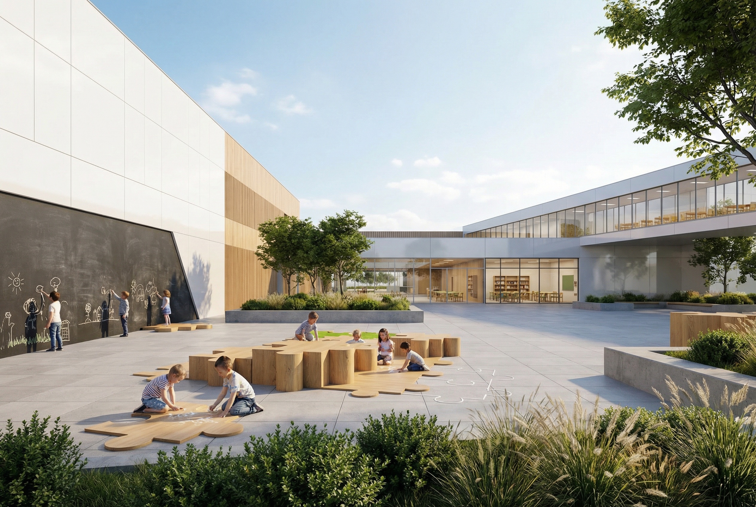 Na jednym z zielonych dachów zlokalizowana została ścieżka edukacyjna. Istota Idei edukacji wyrażona jest w bryłach puzzli ustawionych na dziedzińcu szkoły, na placu przed wejściem głównym i na holach, dając uczniom pretekst do wspinania się na nie i zabawy. W ten sposób staraliśmy się wyrazić zmaganie się z nauką, ale i zabawę z nią. Puzzle zaprojektowano z różnych materiałów, co symbolizuje różne gałęzie nauki. Bryły puzzli zaprojektowano w gabarytach pozwalających używać ich w charakterze mebli terenowych.