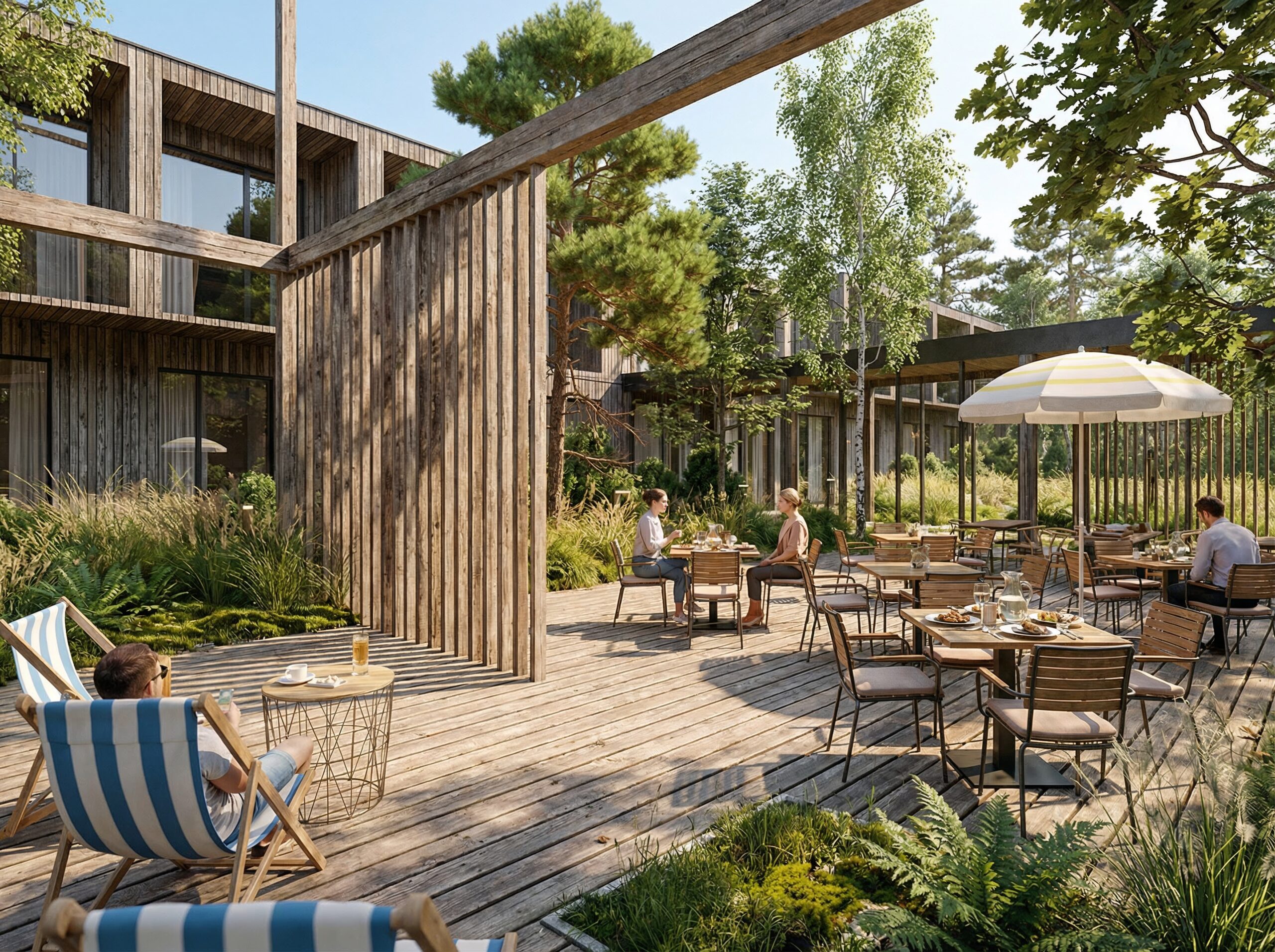 Ląd i obiekty lądowe są stałe i bardziej jednoznaczne w formie, dlatego bryła ma prostą formę, podkreśloną jednolitą strukturą ściany osłonowej. Biała perforowana osłona budynku uspokaja bryłę i wpisuje się w kolorystykę miasta. Perforacja wykonana jest z prostokątów o proporcjach okien modernistycznych budynków Gdyni. Zagęszczenia perforacji tworzą rysunek układający się w izohipsy – poziomice na mapach przedstawiających topografię lądu. Na elewacji naszego projektu przedstawiliśmy topografię gdyńskich klifów. Patrząc na elewację budynku od strony Skweru Kościuszki widzimy, jak część wschodnia budynku – „morze” częściowo przekazuje swoją estetykę budynkowi zachodniemu – „lądowi”. To nasza architektoniczna alegoria. Morze „wlewa” się na ląd i obmywa go swoimi falami. Jest to też przesłanie do nas i przestroga zarazem. Jeśli nie zadbamy o klimat i o naszą planetę, morze zabierze nam najcenniejsze miejsca do życia. Być może również takie, jak ta konkretna lokalizacja. Styk symbolicznego „morza i lądu” zamierzamy podkreślić zmieniającą się estetyką nawierzchni. Południowo-zachodni narożnik budynku, obniża się do poziomu wyjść ewakuacyjnych z klubu „Nowy Pokład”. Obniżenie sprowadza nas poniżej obecnego poziomu morza. Ten poziom też chcemy pokazać na warstwie wykończeniowej elewacji. Jeśli nasz budynek powstanie, chcielibyśmy co 10 lat potwierdzać na elewacji aktualny poziom morza. Gdyby okazało się, że ten poziom się podnosi i „Nowy Pokład tonie”, byłoby to swoistym memento dla odwiedzających budynek.